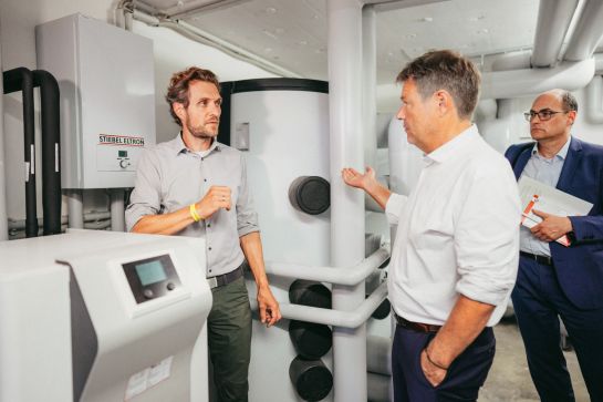 Habeck zeigte sich beeindruckt von den Fortschritten und der Innovationsbereitschaft von spar+bau. Das Projekt zeige, wie die Wärmewende auch im Bestand gelingen kann. Es sei ein positives Beispiel dafür, wie erneuerbare Energien den CO₂-Ausstoß reduzieren und gleichzeitig den Wohnkomfort erhalten. Begeistert war er von der Effizienz der installierten Wärmepumpe, die mit einer Vorlauftemperatur von 40 bis 45 Grad arbeitet – im Vergleich zu herkömmlichen Gasheizungen, die deutlich heißer werden. Vorstand Rainer Detjen stellte dabei klar, dass trotz der niedrigeren Vorlauftemperaturen die Wohnräume angenehm warm bleiben, auch dank der umfassenden Fassadendämmung und des Austauschs der Fenster, die ebenfalls Teil der Sanierungsmaßnahmen waren.