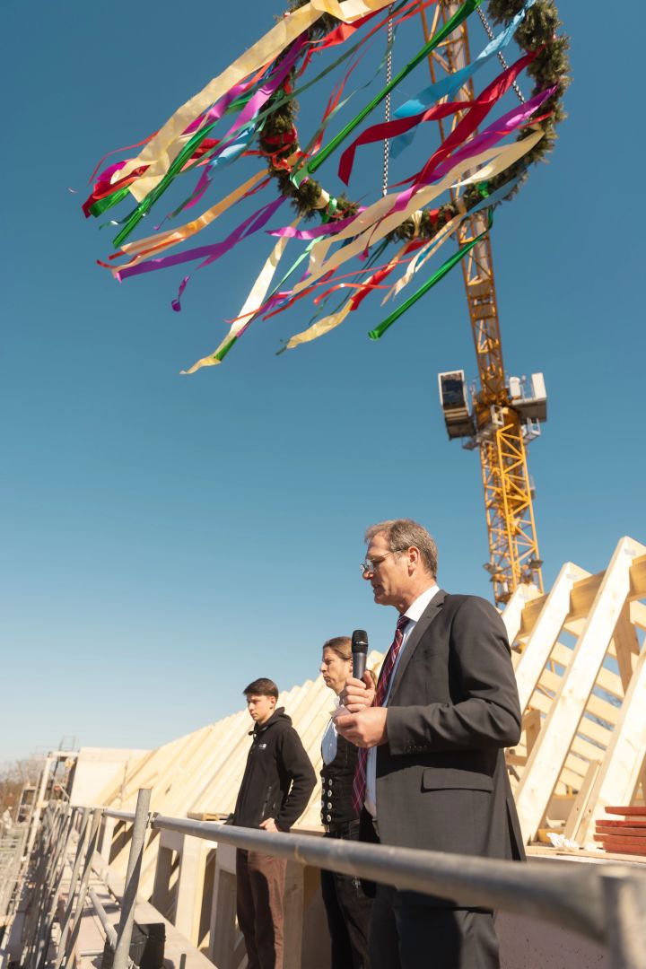 Für die feierliche Rede beim Richtfest stieg spar+bau-Vorstand Rainer Detjen auf das Gerüst des Rohbaus und bedankte sich herzlich bei allen Beteiligten. Detjen lobte den reibungslosen Baufortschritt und den gelungenen Entwurf: „Grundlegende Idee des Gebäudes ist die Laubengangerschließung, sodass dort Kommunikationsflächen entstehen. Denn das ist es ja, was eine Genossenschaft ausmacht: das Gemeinsame, das Miteinander, das Zueinanderfinden.“