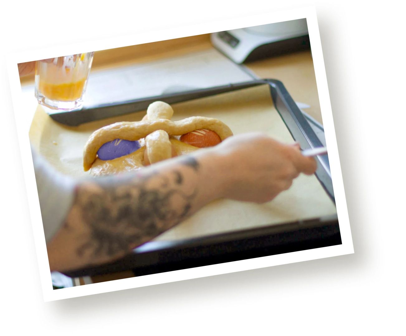 Mehl auf die Arbeitsfläche streuen und den Ofen auf 180 °C vorheizen. Den Teig aus der Schüssel nehmen, gut durchkneten und zu 1 großen oder 2 kleinen Laiben formen. Den Laib auf ein mit Backpapier ausgelegtes Blech legen und mit den natürlich gefärbten Eiern dekorieren. Alles mit der Ei-Wasser-Mischung bestreichen. Bei 180 °C goldbraun backen und auf einem Gitter auskühlen lassen.