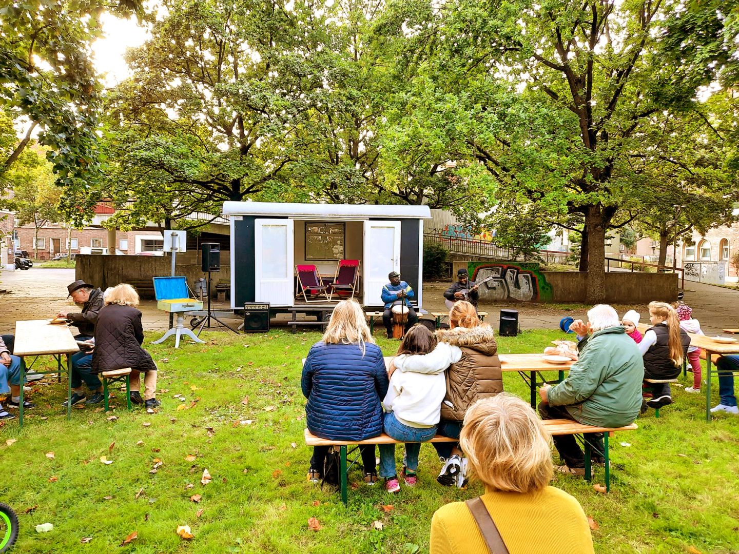 Gemeinschaftsnachmittag mit langer Tafel zum Speisen und mit Hip-Hop-Songs der Mädchen aus dem Stadtteilzentrum Ricklingen
