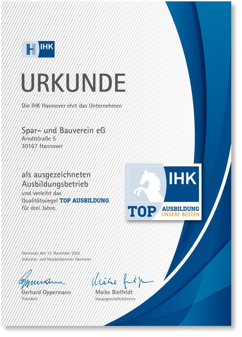 Vor diesem Hintergrund gewinnt die Qualität der Ausbildung zunehmend an Bedeutung, sowohl für die Attraktivität eines Unternehmens als auch für seine Wettbewerbsfähigkeit. Dass spar+bau diesen Anspruch erfüllt, bestätigt die IHK Hannover 2025 mit der erneuten Verleihung des Zertifikats „TOP Ausbildung“. Bereits 2019 und 2022 wurde das hohe Niveau der Ausbildung bei spar+bau ausgezeichnet.